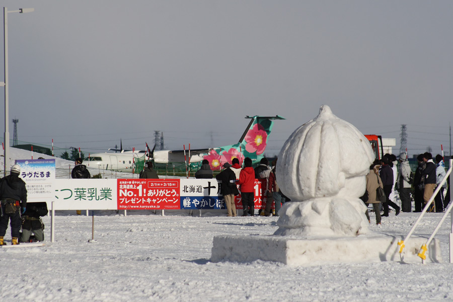 この冬は、つどーむが雪まつり会場となったので、丘珠を発着する飛行機が会場から見られます(笑)