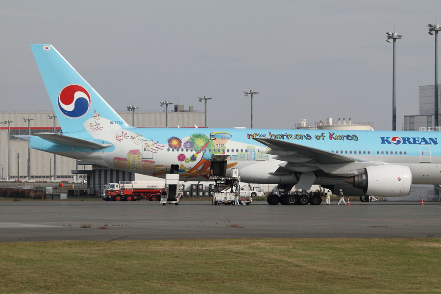 昨夜飛来し、ステイしていた大韓航空のB777-200ER。