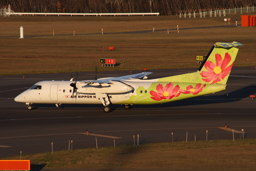 新千歳では久しぶりに見た、A-netのDHC8-Q300、コスモス(JA804K)。