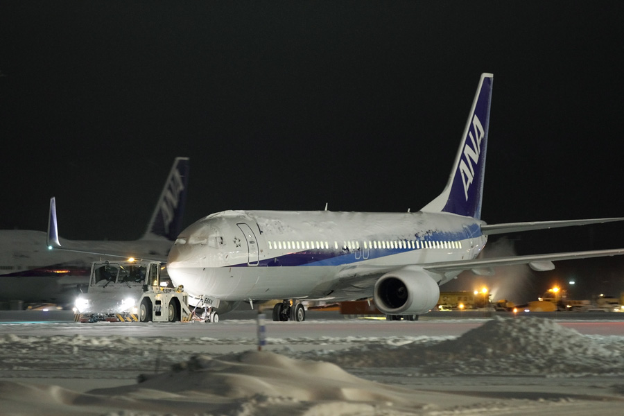 深夜になってエプロン除雪の為にか、オープンスポットへ、トーイングラッシュ(;・∀・)