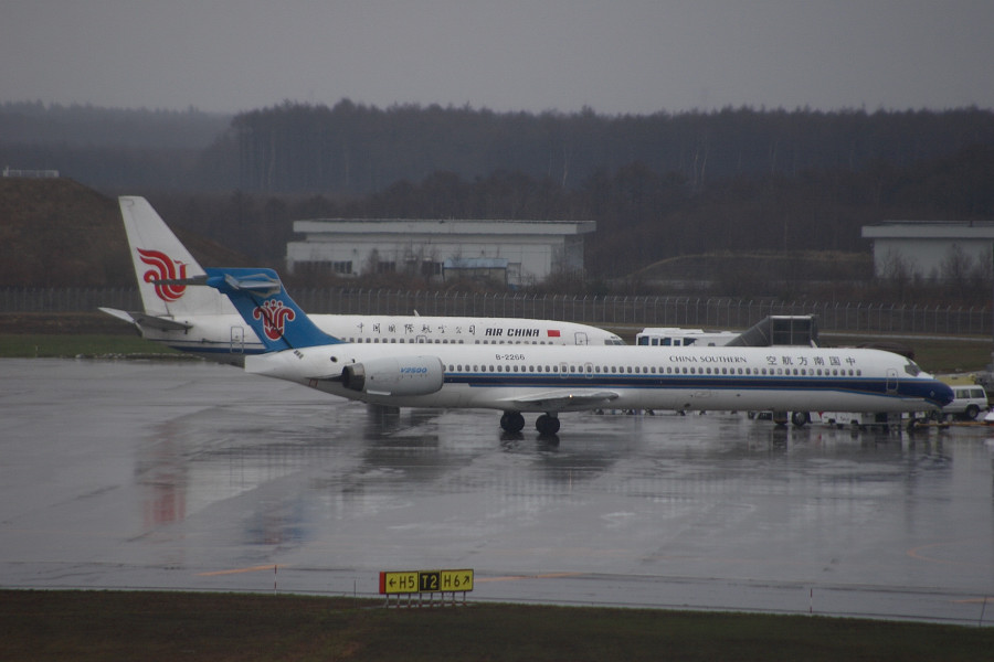大連線の就航の為、国際線用スポットが埋まってしまい20番台スポットへ追いやられて?しまった、エアチャイナと瀋陽線のMD-90( ̄□ ̄;)