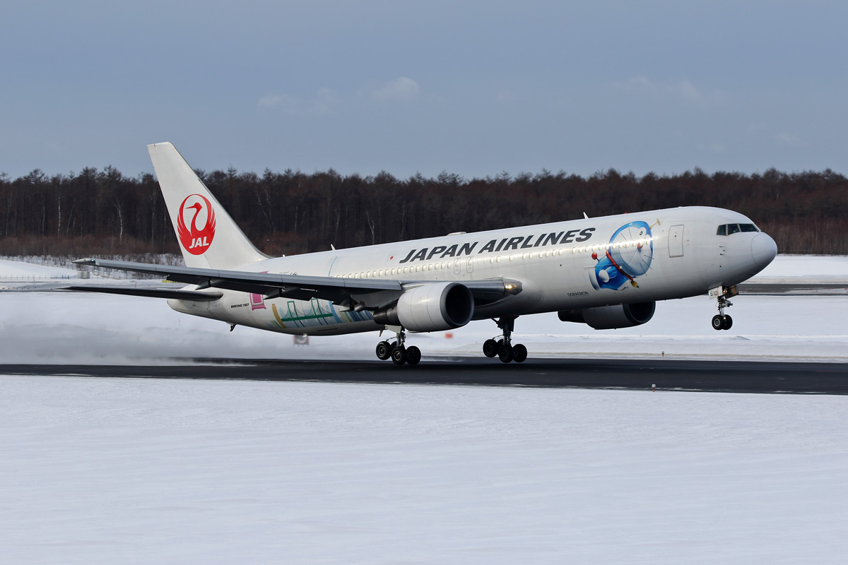 昨夜、成田からのJAL3049便で飛来した、インター機材の「ドラえもんJET」