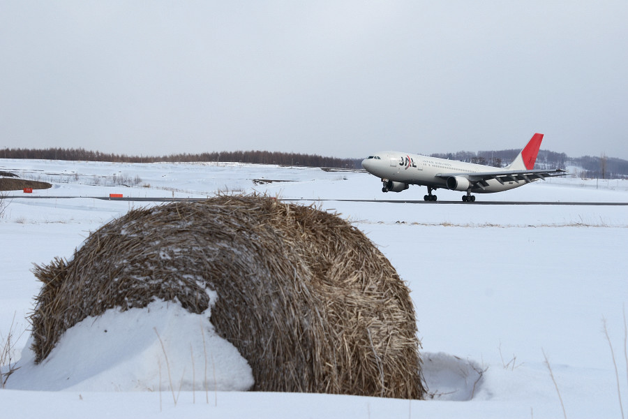 続いてのJALの降りは、この前もチャレンジした牧草ロールとの絡み(^_^;)