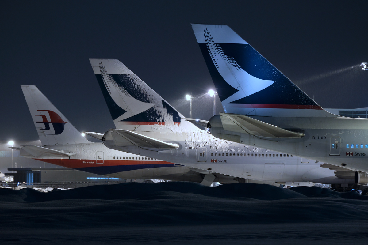 大雪で2機がステイ。隣にはこちらも既に退役してしまったマレーシアのB777。