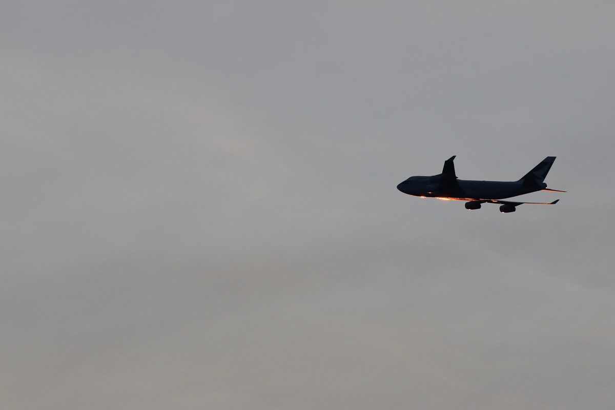 雲の切れ間から日の出が差しこみ、機体に映り込みます。