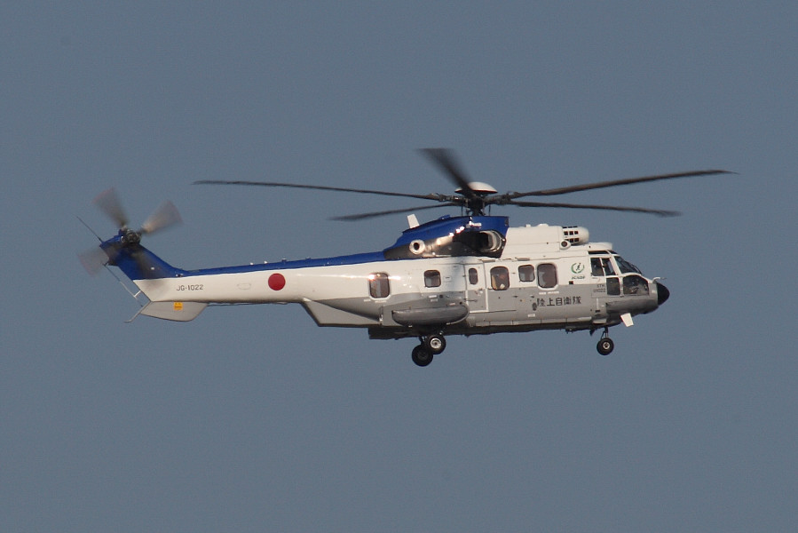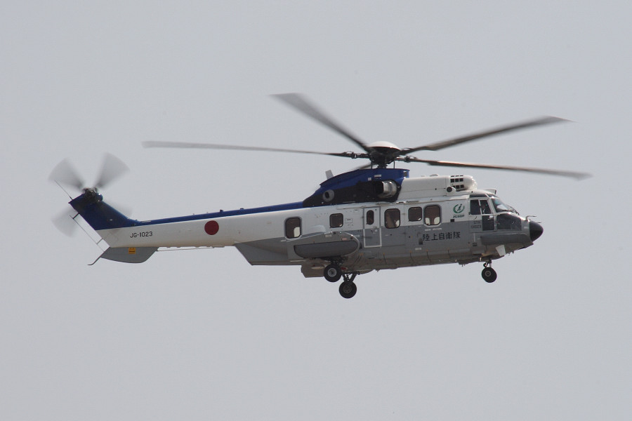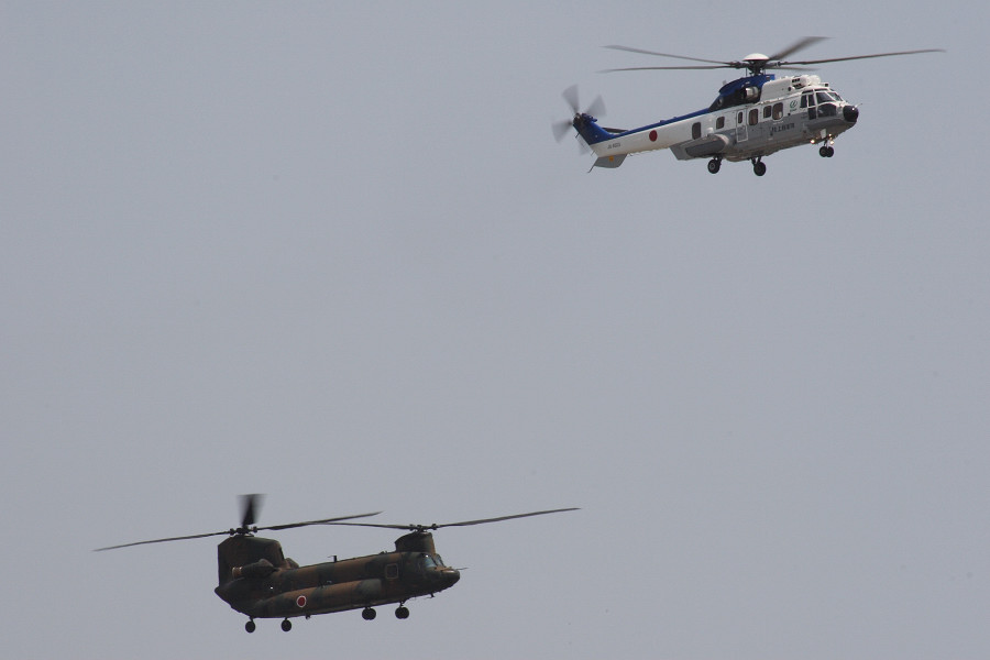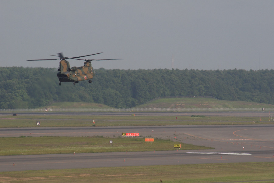 空港側に、陸上自衛隊のEC‐225LP、チヌーク、UH-60のフォーメーションで飛来です(^_^;)