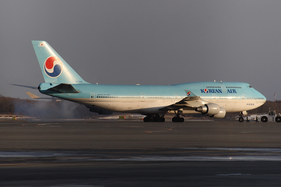 KE9765/9766便で飛来したB747-400(HL7495)。