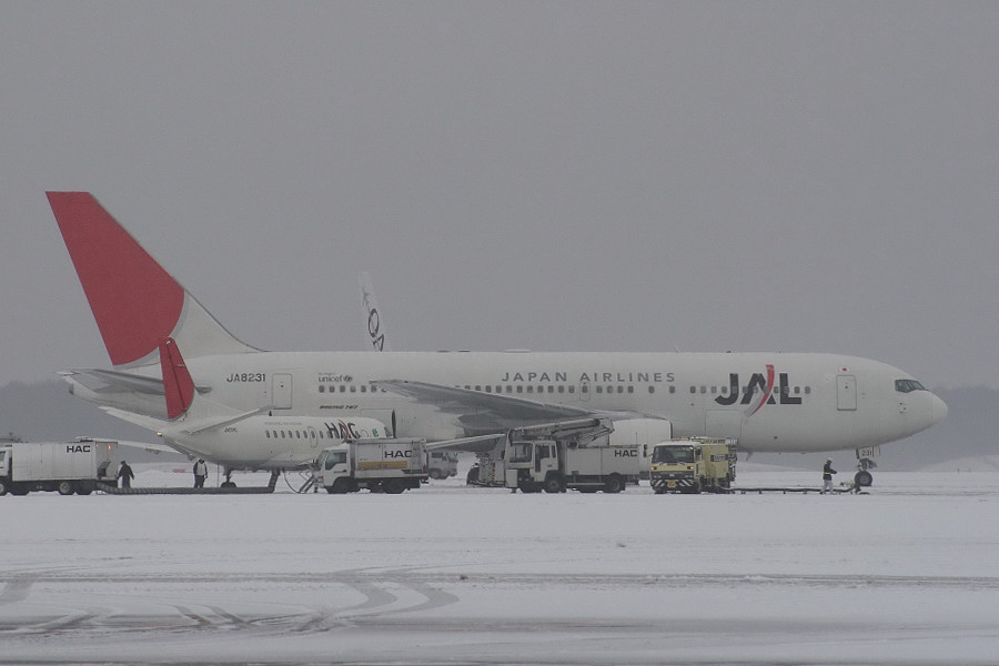 朝、臨時便で東京から到着したJALのB767-200(JA8231)。