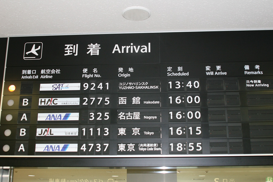 到着便を表示する、パタパタボード(正式名称が分かりません(爆))の航空会社欄には、しっかりと「SAT」のロゴが(^_^)
