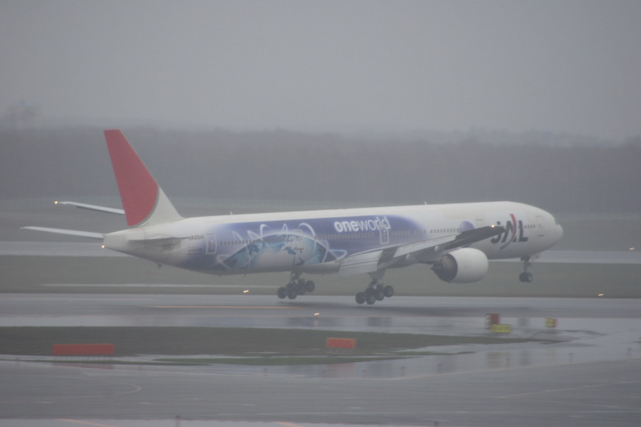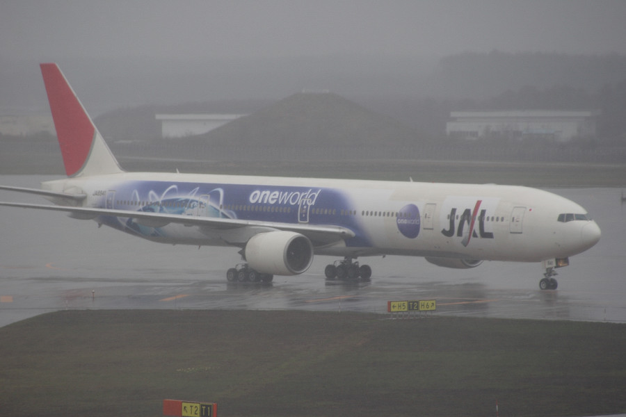 JL511便で飛来した「JALワンワールド・デザイン」機。