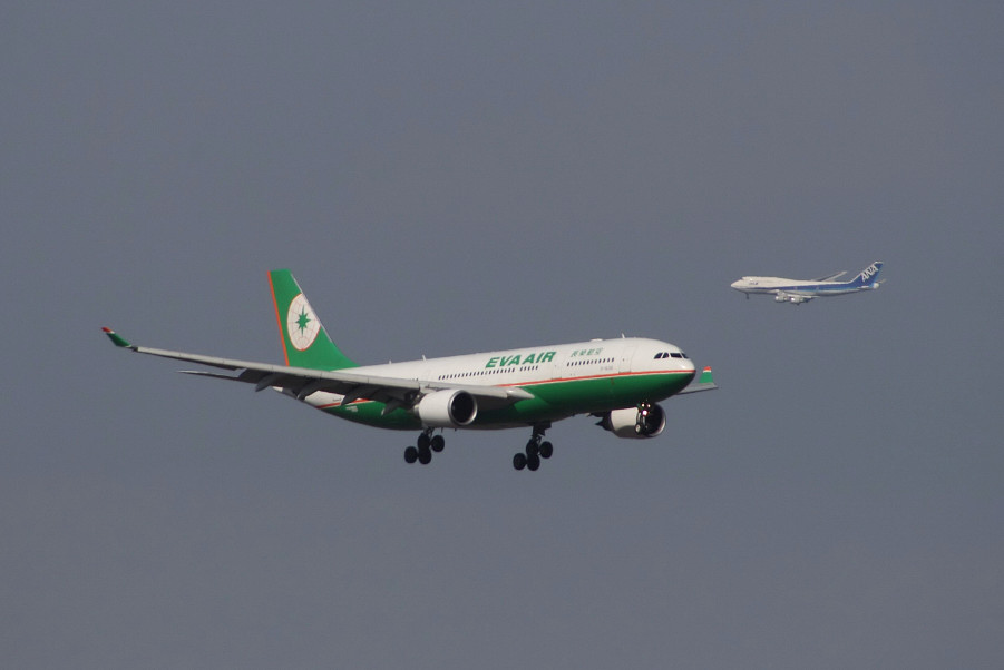 この日は天気が良く、着陸機はビジュアルアプローチで降りて来ており、タイミングよくエバーと後続のANAの744が絡んでくれました(*´∀`)ノ