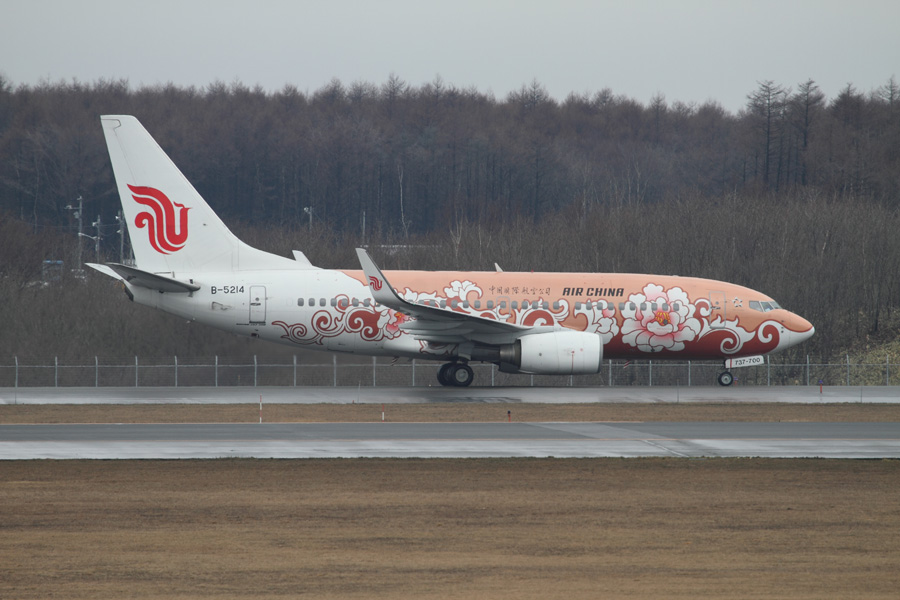 エアチャイナはB737-700型の牡丹塗装(B-5214)が飛来。